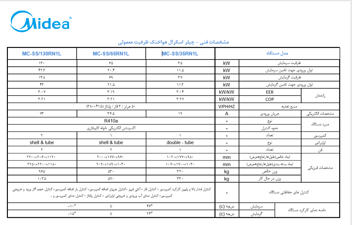 چیلر ۴۰ تن میدیا مدل MC-SS130/RN1L یکی از به روزترین و جدیدترین مدلهای چیلر اسکرال ساخت شرکت میدیا چین است. این چیلر دو کمپرسور اسکرال با سرعت ثابت دارد که ۱۳۰ کیلووات سرمایش تولید می کند. ضریب بازدهی در این چیلر ۳٫۰۷ است که در چیلرهای تراکمی هواخنک عدد بسیار خوبی است. چیلر اسکرال TTM حدود ۴۲٫۳ کیلووات برق مصرف می کند و نیاز به برق سه فاز برای راه اندازی و عملکرد خود دارد.